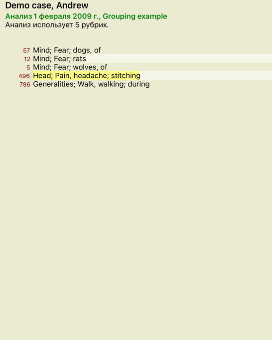 Например, желание есть пиццу. Что именно привлекает человека к пицце? Может быть это тесто (мучные издения, еда), томаты, салями, рыба, сыр или маслины. Может быть полезно скомбинировать несколько рубрик в одну новую группу, без нарушения структуры анализа добавлением множества отдедльных рубрик не описывающих основные черты пациента.