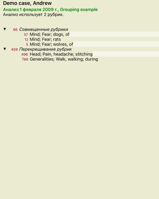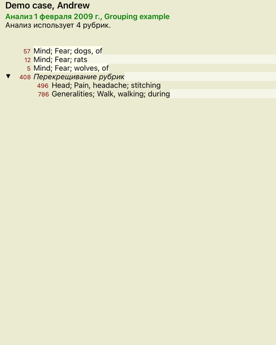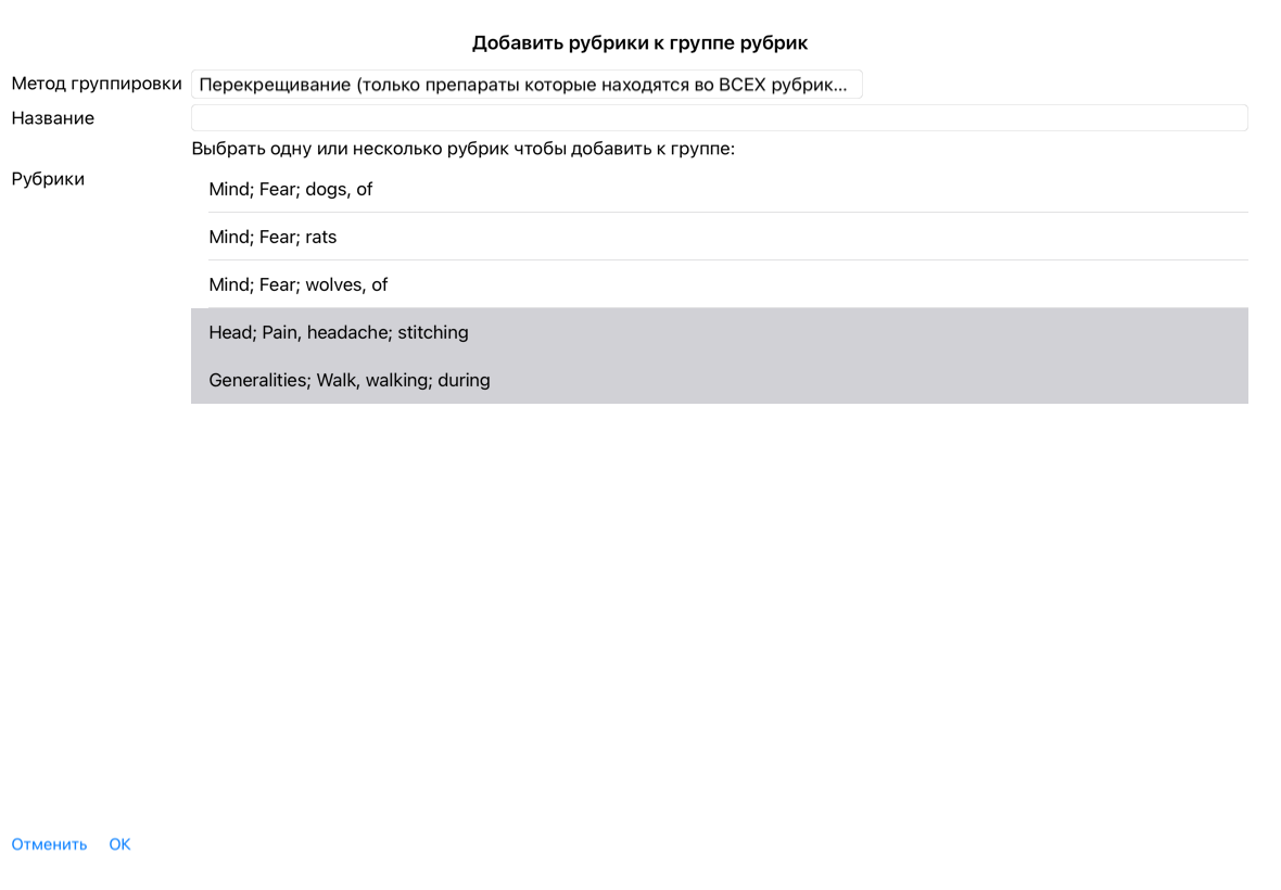 Когда несколько рубрик перекрещены, группа содержит только те препараты которые находятся во всехрубриках этой группы. Препарат получает градацию посамойнизкой из всех рубрик группы.